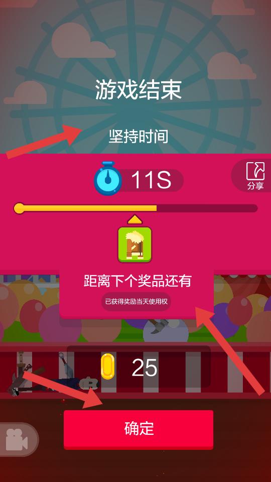 4、游戲結束后,會顯示堅持時間,獲得的金幣等,還有距離下個獎品的提示,點擊確定,可繼續游戲或查看獎勵。
