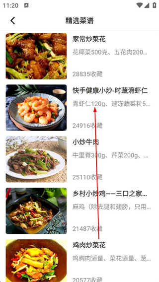 2、在精選菜譜列表中選擇快手健康小炒時蔬滑蝦仁,點擊進入該菜譜的詳情頁面,查看所需食材和步驟說明。