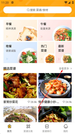 1、打開家常菜做法app,進入首頁瀏覽精選菜譜板塊,點擊查看更多選項,進入精選菜譜列表頁面,查看各類菜品推薦。