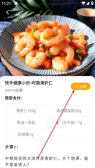 3、在菜譜詳情頁面查看需要準備的青蝦仁速凍蔬菜粒等食材,點擊收藏按鈕,將該菜譜保存至個人收藏列表。