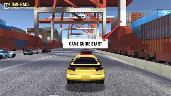 1、進入游戲時會有GAME GUIDE START引導,跟著它能熟悉游戲,比如了解在碼頭賽道及時抵達檢查點的規則。