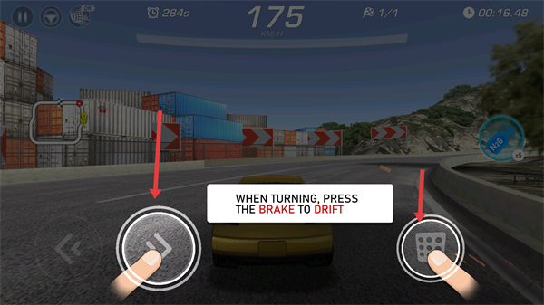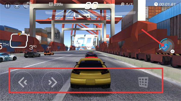 3、進入場景實際駕駛時,屏幕左側左右箭頭控制方向,右側按鍵可能用于加速等操作,要熟練運用來操控賽車。