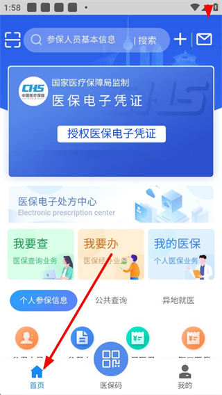 1、進入首頁,可授權醫保電子憑證,使用醫保查詢業務、醫保經辦業務等功能,查看個人參保信息、公共查詢、異地就醫等服務,底部有首頁、醫保碼等入口。
