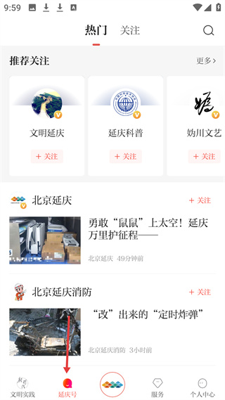 1、延慶號板塊設熱門、關注欄,推薦文明延慶等賬號,發布北京延慶鼠鼠上太空、延慶消防安全提示等資訊,傳遞區域動態。
