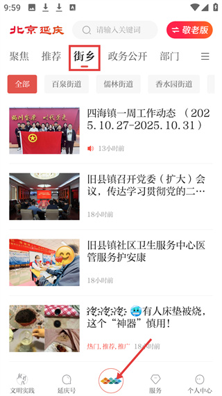 2、北京延慶板塊街鄉欄目,展示四海鎮、舊縣鎮工作動態及衛生服務、安全提示等新聞,呈現鄉鎮發展與民生資訊。