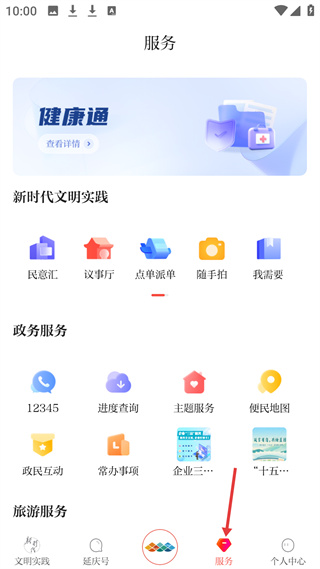3、服務板塊含新時代文明實踐、政務服務、旅游服務,有民意匯、12345等功能,提供文明實踐、政務辦理、旅游服務入口。
