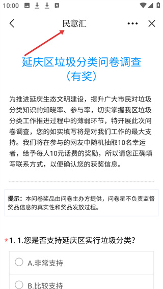 4、民意匯板塊開展延慶區垃圾分類有獎問卷調查,旨在推進生態文明建設,提升市民分類知曉率,參與者有機會獲話費獎勵。