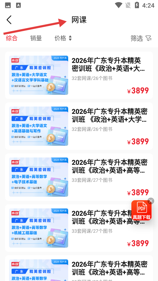 1、網課界面羅列2026年廣東專升本精英密訓班等課程,可依綜合等條件篩選部分有真題下載標識。
