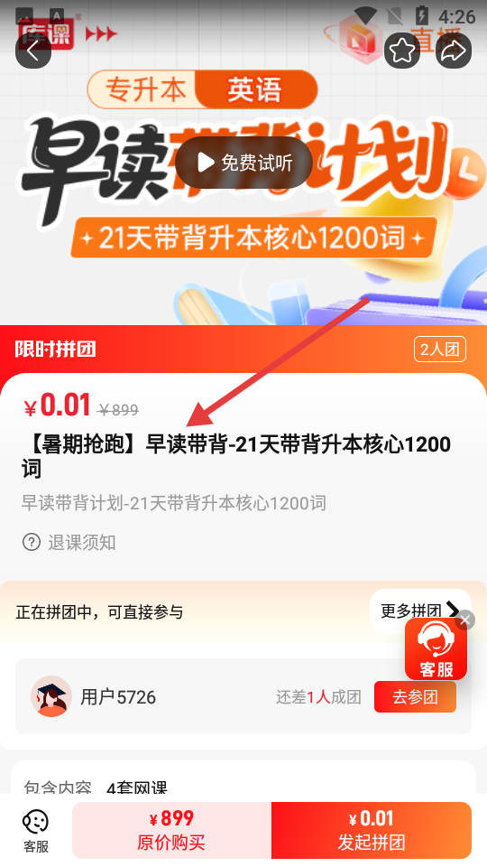 4、限時拼團頁限時拼團頁,展示專升本英語早讀帶背計劃,含拼團價格、原價及參與拼團信息,支持發起拼團或直接參團。