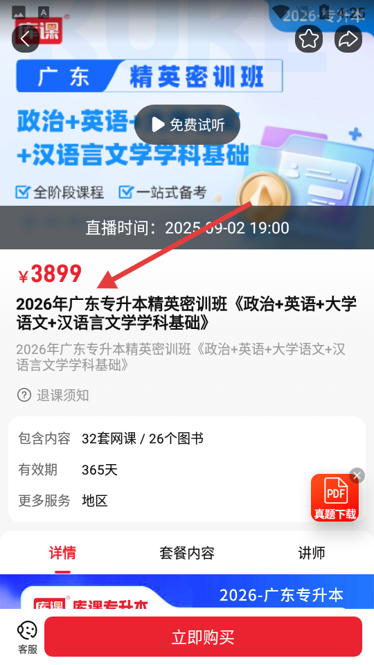 3、課程詳情頁針對廣東專升本精英密訓班,呈現課程科目、價格、服務內容、有效期等,提供免費試聽與購買入口。