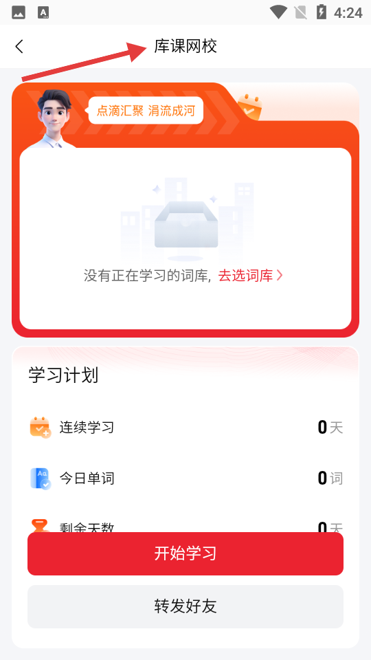 2、學習頁面顯示庫課網校提示無正在學習詞庫,有學習計劃板塊,可查看連續學習天數等信息能開始學習或轉發。