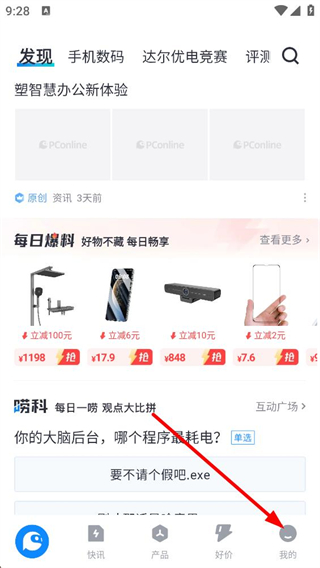 1、進入應用先看到發現頁面,可瀏覽資訊好物推薦及互動話題,底部設有首頁快訊產品好價我的等功能入口,便于切換不同板塊。