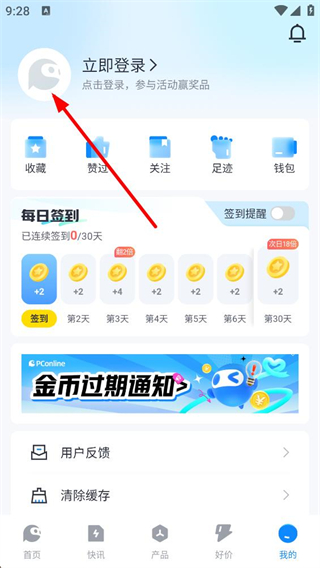 2、點擊底部我的進入個人中心,可進行登錄操作,還能使用收藏贊過關注等功能,參與每日簽到獲取金幣,查看金幣過期通知。