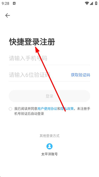 3、個人中心點擊立即登錄后,進入快捷登錄注冊界面,需輸入手機號碼及6位驗證碼,勾選協議后可完成登錄或注冊。