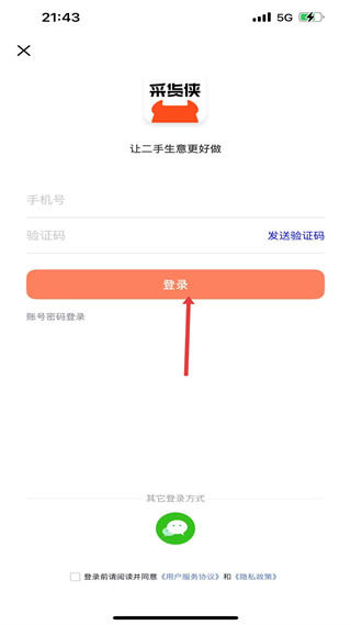 1、登錄界面,有手機號驗證碼、賬號密碼及微信登錄方式,助力二手生意高效開展。