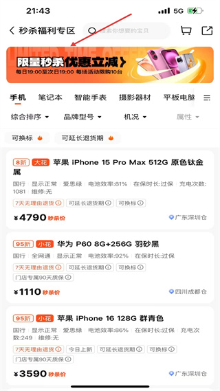3、秒殺福利專區,有限量秒殺活動,展示多款二手手機,標注機況價格及售后,提供7天無理由退貨等服務。