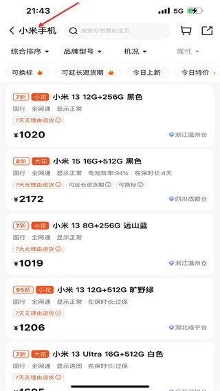 4、小米手機專區,展示多款小米二手手機,標注機況配置價格及倉儲地,有7天無理由退貨等售后政策。