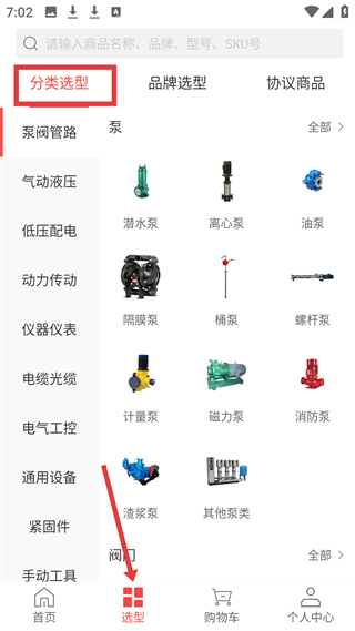 2、選型頁面,有分類選型等標簽,展示泵閥管路等工業品分類,用戶可通過分類查找所需工業品。