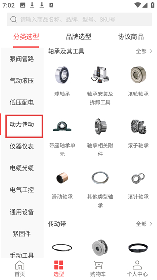 3、選型頁面的動力傳動分類下,有軸承及其工具等細分品類,展示多種軸承類型,方便用戶選擇動力傳動類產品。