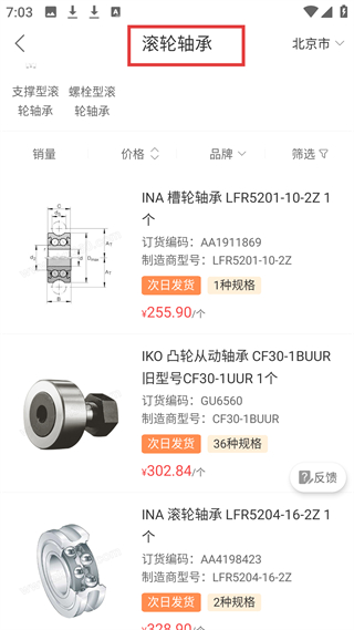 4、滾輪軸承商品列表,展示不同品牌型號的滾輪軸承,包含訂貨編碼、價格、發貨時間等信息,用戶可選購合適的滾輪軸承。