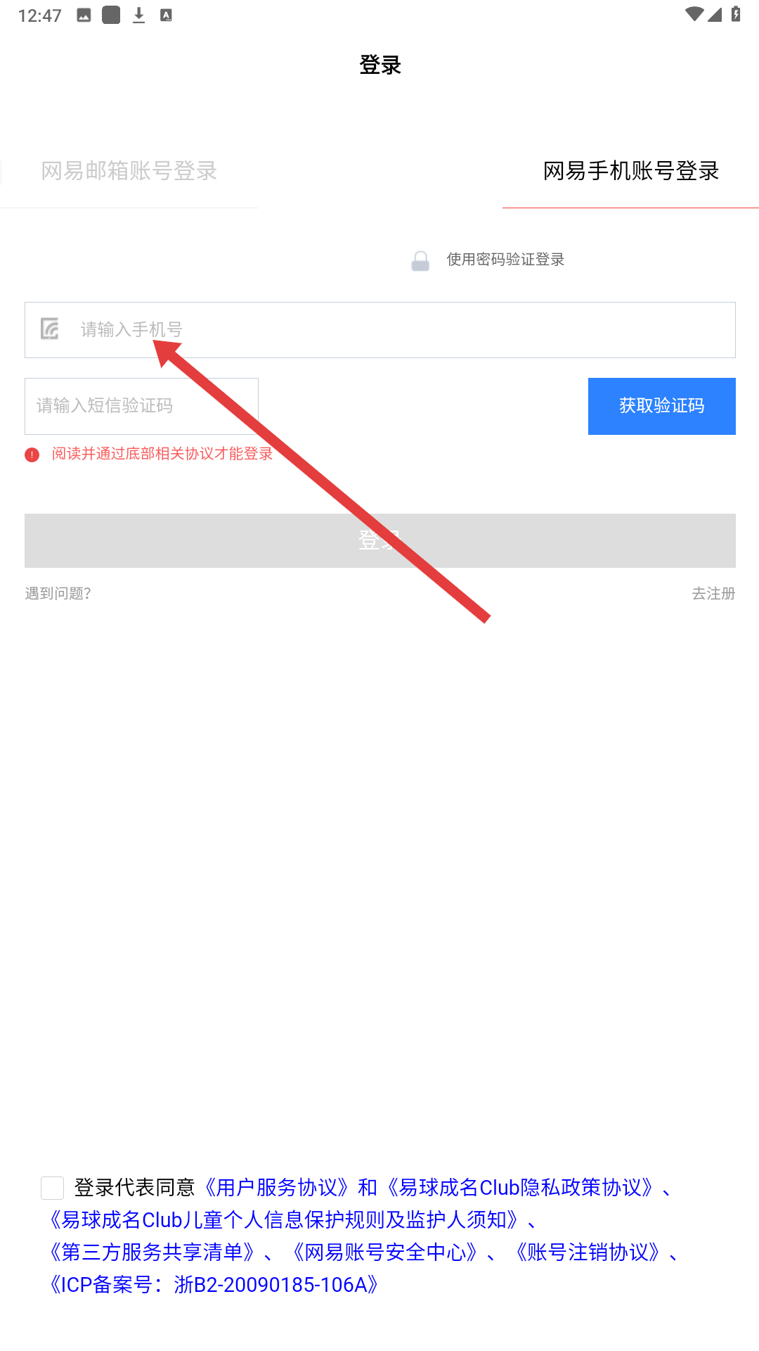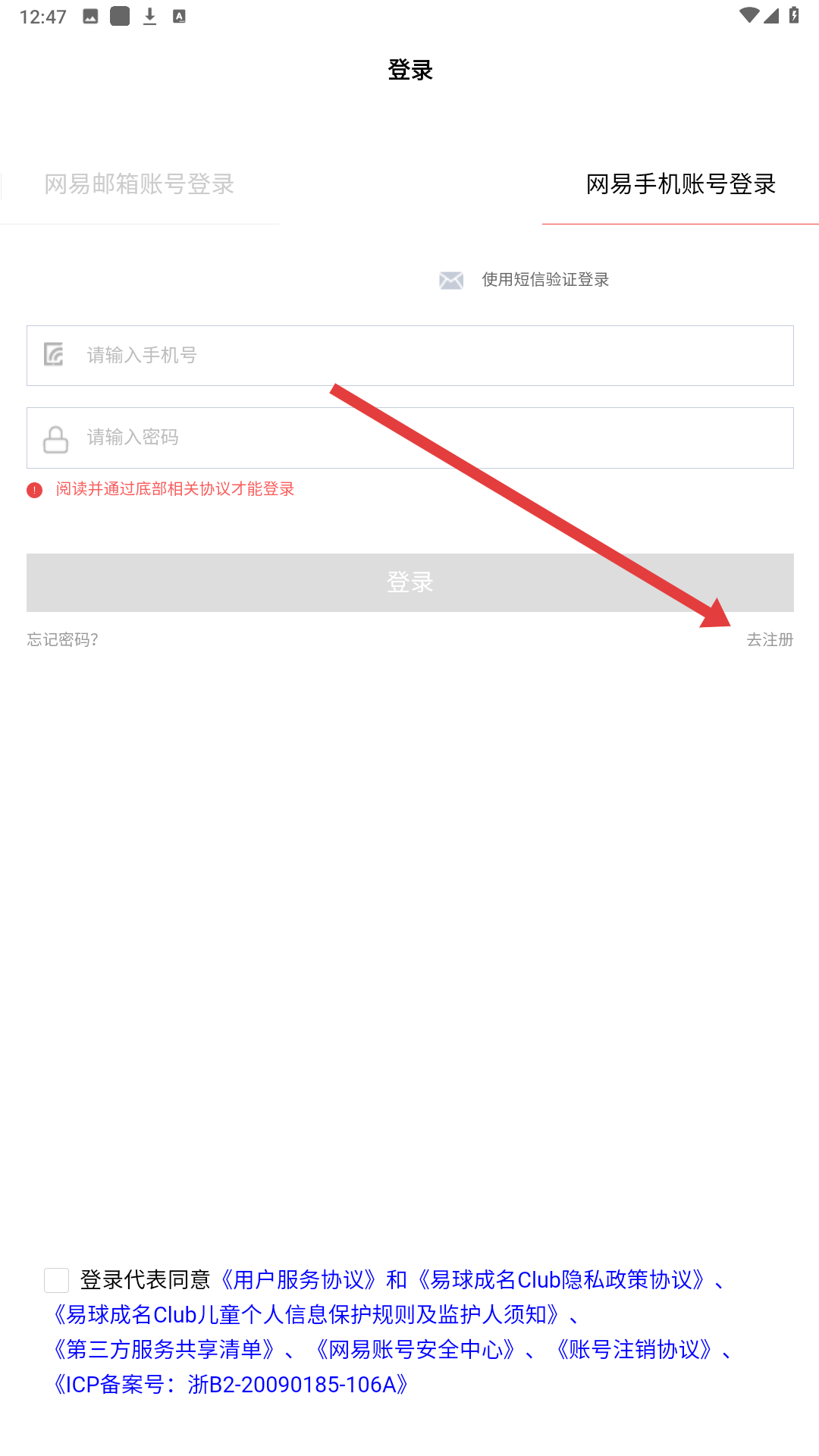 1、進入登錄界面,可選擇網易手機賬號登錄,若沒有賬號可點擊去注冊,注冊前需閱讀并同意相關協議。