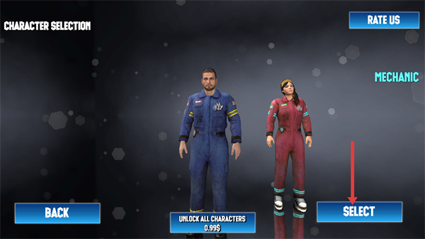 2、來到角色選擇界面,能看到兩位身著不同顏色工裝的角色,選擇右側角色后點擊SELECT,即可確定操控角色。