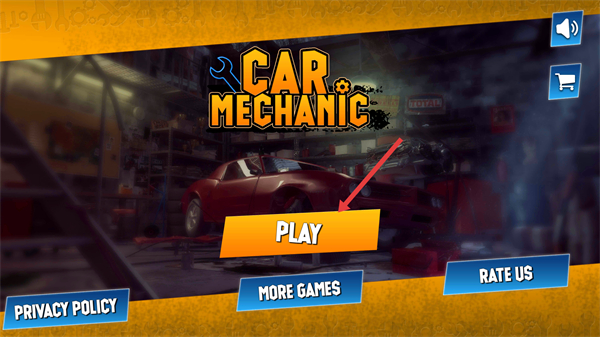 1、進入游戲主界面,點擊醒目的橙色PLAY按鈕,即可開啟修車之旅,開啟后續的游戲操作流程。