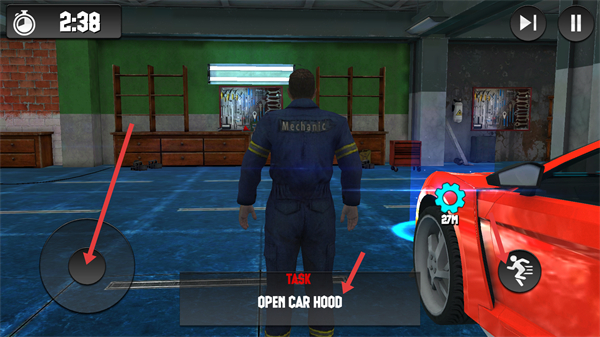 4、進入關卡后按照任務提示OPEN CAR HOOD,通過左側虛擬搖桿操控角色移動到紅色汽車旁,去打開汽車引擎蓋推進修車任務。
