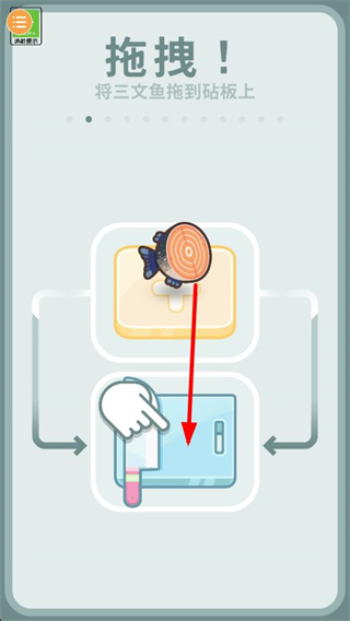 2、取出三文魚后,看到拖拽將三文魚拖到砧板上的提示,拖動三文魚到砧板區域,完成食材的轉移,推進壽司制作流程。