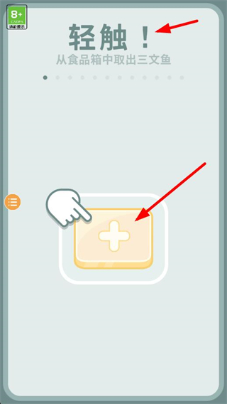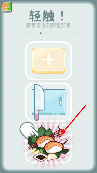 1、根據輕觸從食品箱里取出三文魚的提示,點擊帶加號的食品箱,取出三文魚食材,為后續制作壽司做準備。
