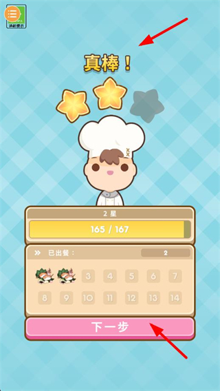 4、出現真棒的評價界面,顯示獲得2星評級,點擊下一步按鈕,進入下一輪的壽司制作任務,繼續游戲進程。