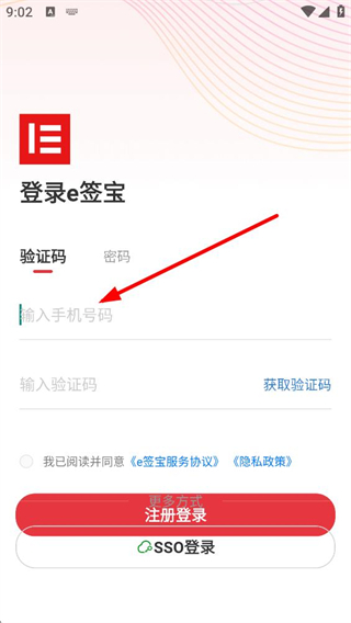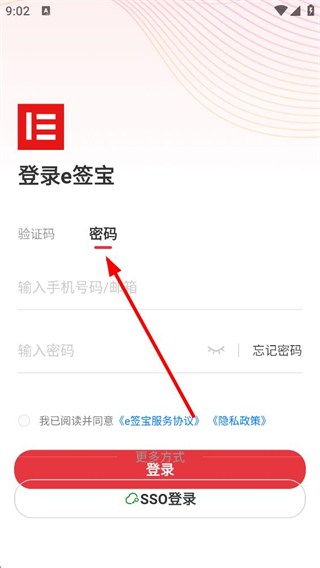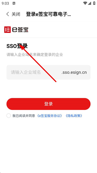 4、選擇SSO登錄時,輸入企業域名,勾選同意協議后點擊登錄,即可通過企業域名完成e簽寶的登錄。