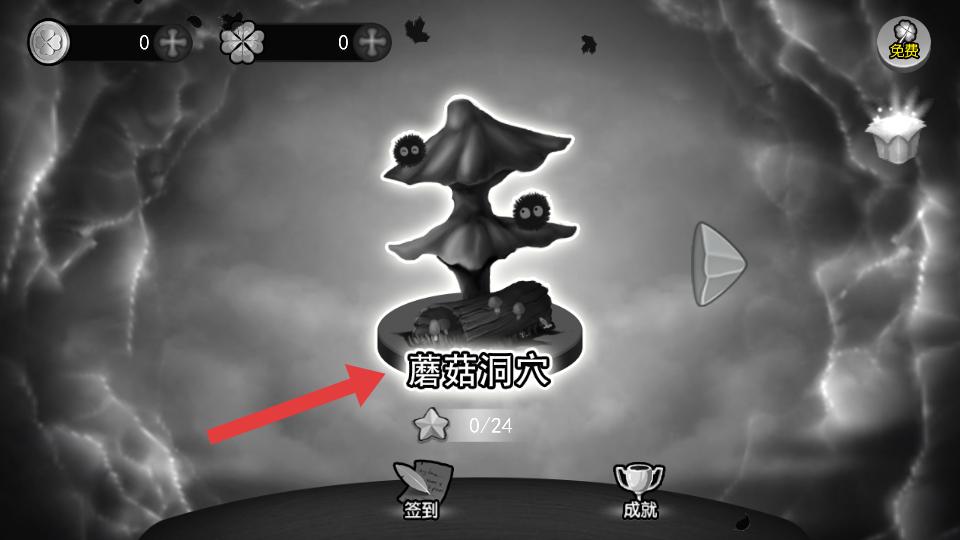 1、進入游戲,能看到蘑菇洞穴場景,還有簽到,成就等功能按鈕,可先熟悉界面,為后續探索做準備。