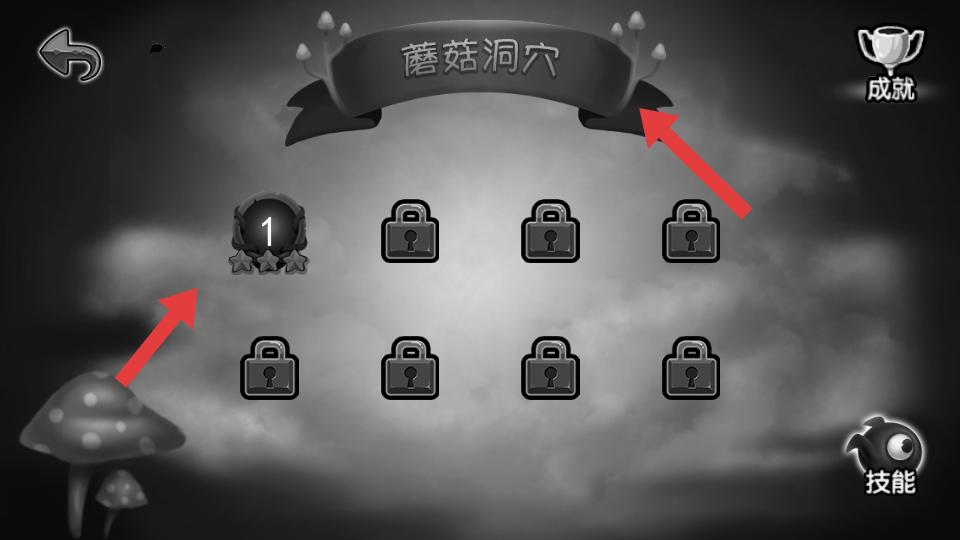 2、在關卡選擇界面,能看到蘑菇洞穴下有多個關卡,其中第1關可進入,其余關卡暫鎖,點擊第1關開啟冒險。