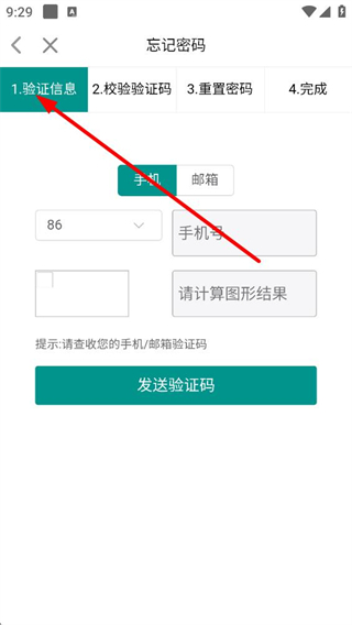 4、若忘記密碼,可進入忘記密碼頁面,通過驗證信息、校驗驗證碼、重置密碼、完成這四個步驟來重置密碼,驗證信息可選擇手機或郵箱方式。