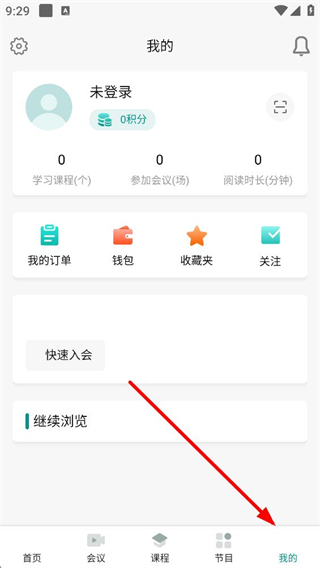 2、點擊我的進入個人頁面,能看到未登錄狀態下的積分、學習課程、參加會議、閱讀時長等信息,還有我的訂單、錢包、收藏夾等功能選項。