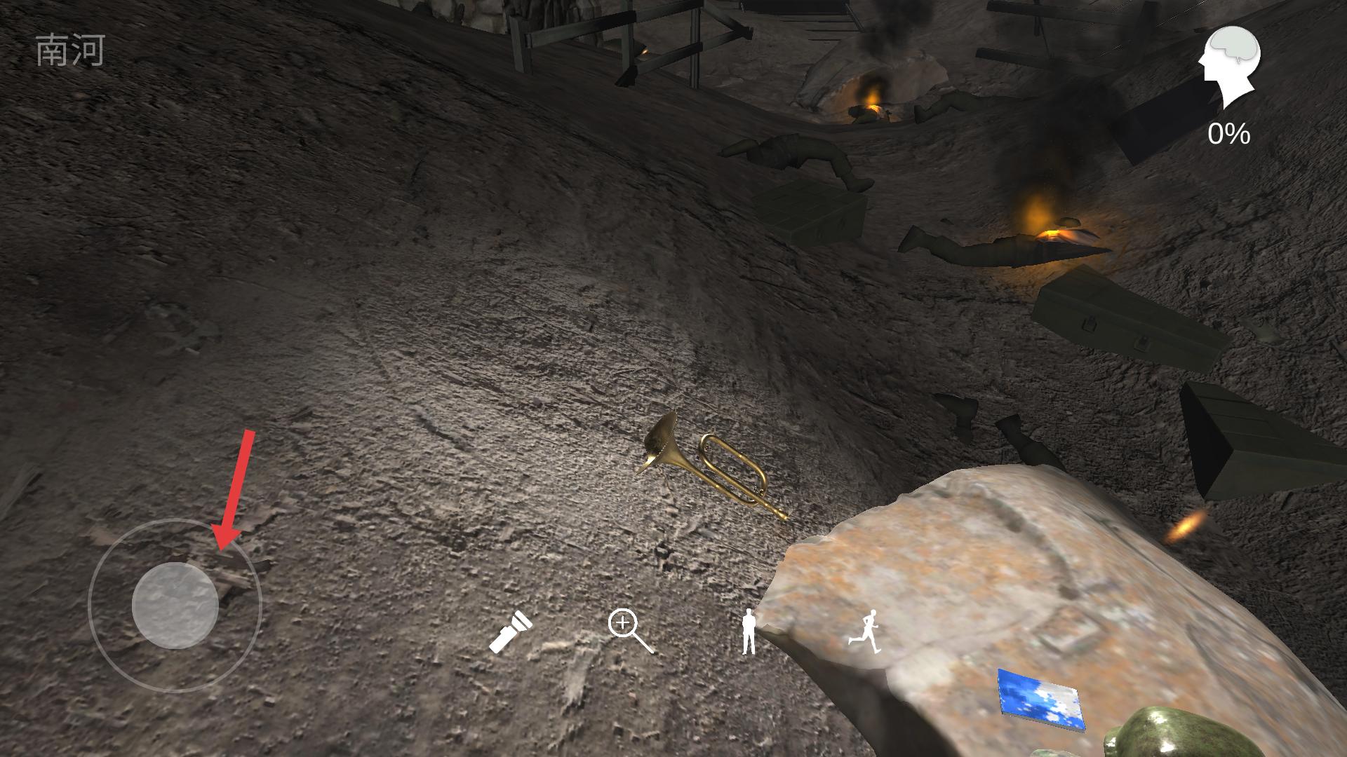 2、進入游戲場景后,可通過左下角的虛擬搖桿來控制角色移動,在場景中仔細搜尋,能發現像小號這樣的物品。