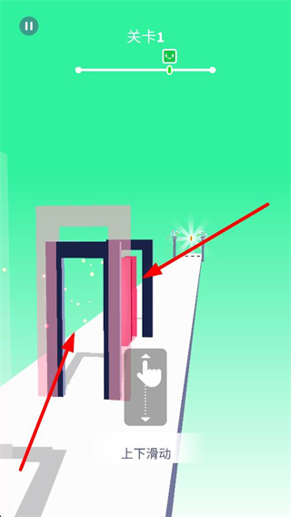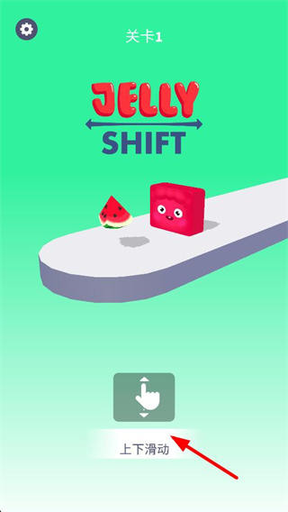 1、進入關卡1,通過上下滑動操作控制紅色果凍移動,靠近場景里的西瓜道具,開啟這一關卡的收集與移動任務。