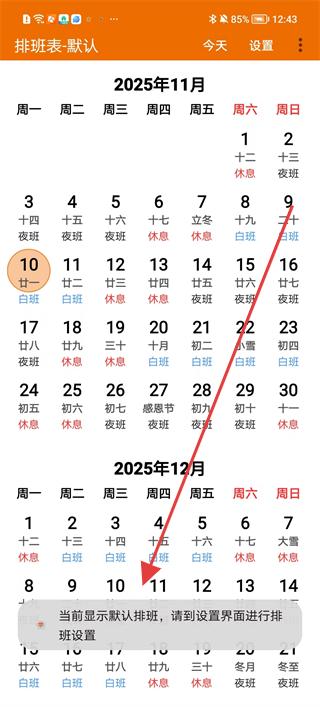 4、在排班表頁面查看默認排班,若需修改,進入設置界面進行排班設置,也可查看不同月份的排班情況,全面管理個人排班。
