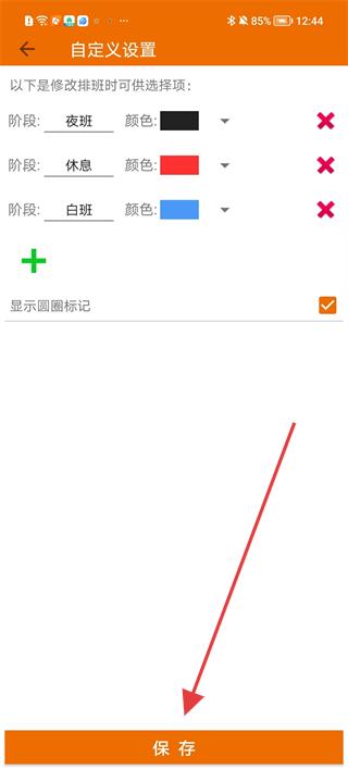 2、進入自定義設置頁面設置夜班、休息、白班的階段顏色,勾選顯示圓圈標記,點擊保存,完成排班階段自定義。
