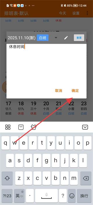 3、在日歷頁面雙擊日期彈出編輯框,輸入休息時間等備注,點擊確定,完成當天排班備注的添加。