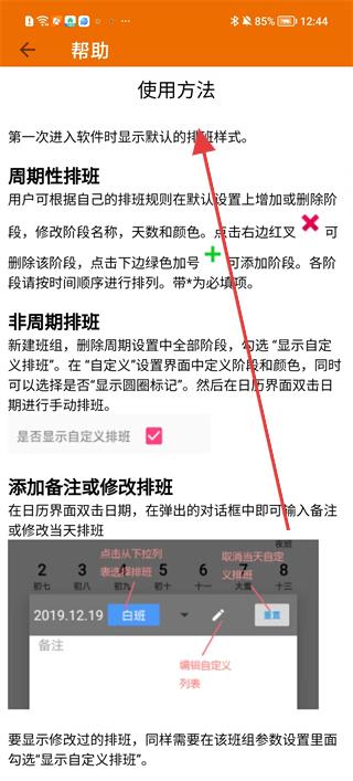 1、進入APP幫助頁面查看使用方法,了解周期性排班、非周期性排班及添加備注的操作流程,為排班設置做準備。
