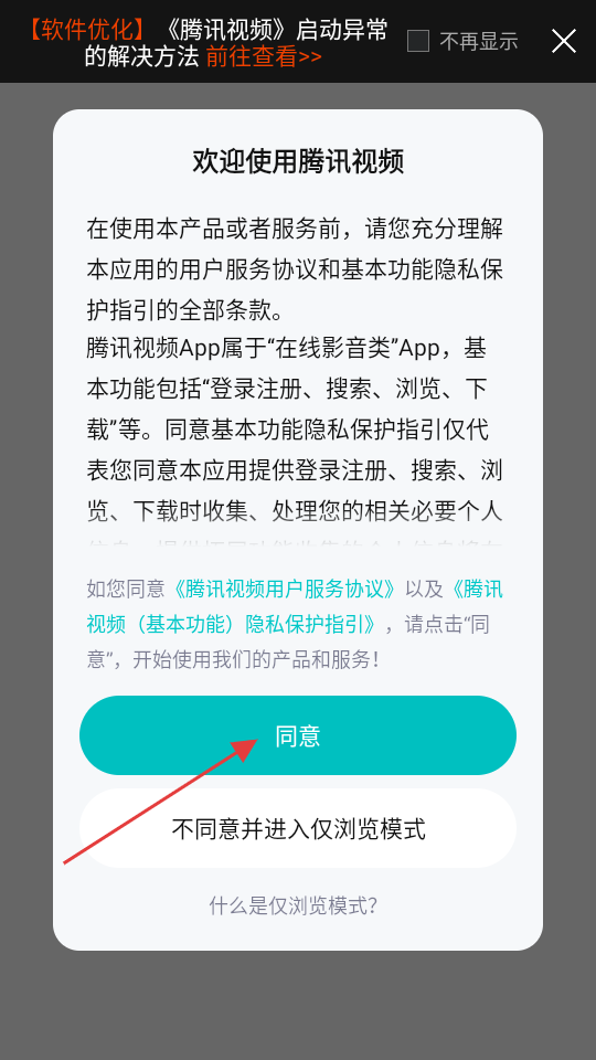 1、打開騰訊視頻映入眼簾的是啟動提示頁,需了解用戶服務協議與隱私指引,可選擇同意開啟服務或進入僅瀏覽模式。
