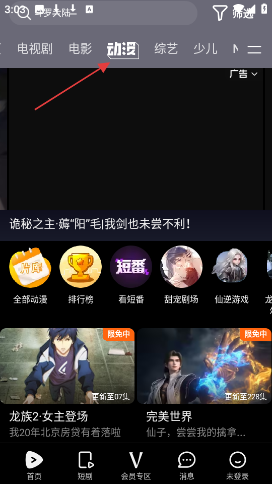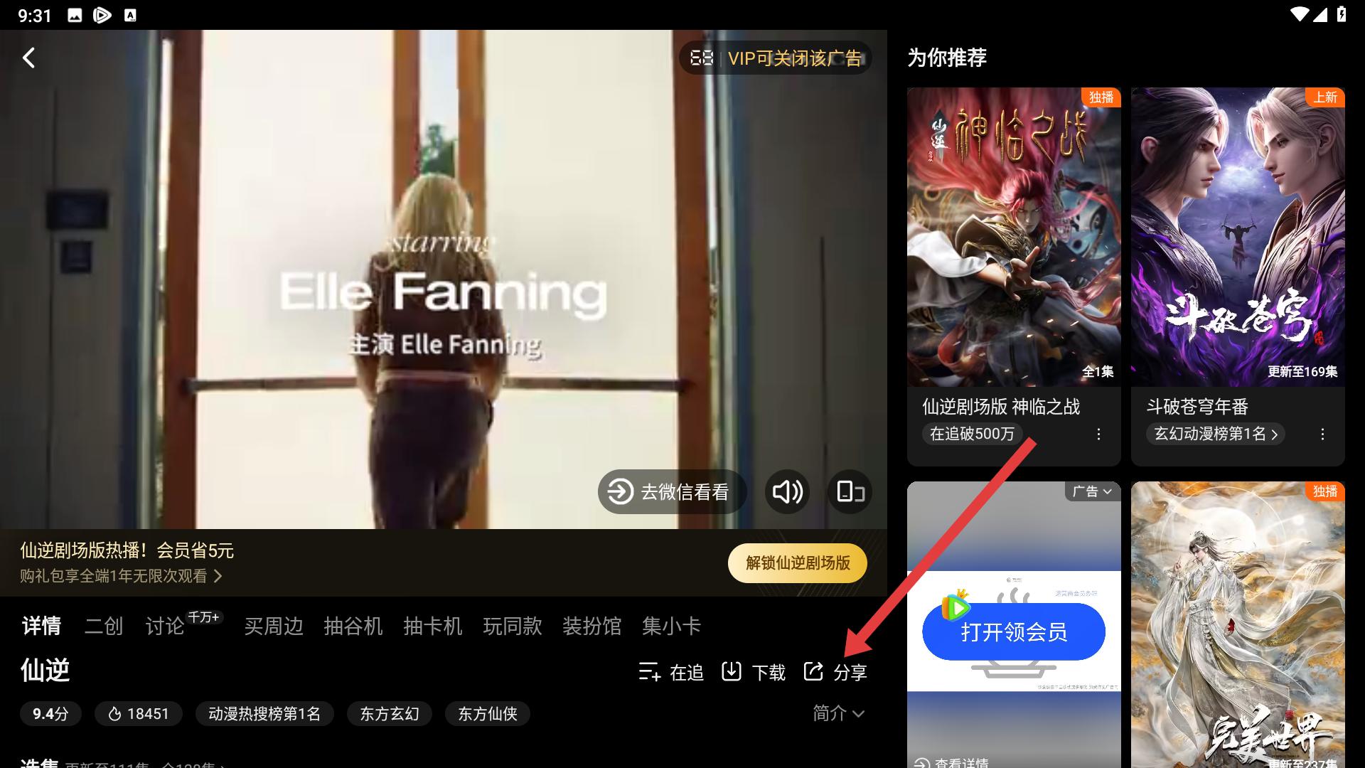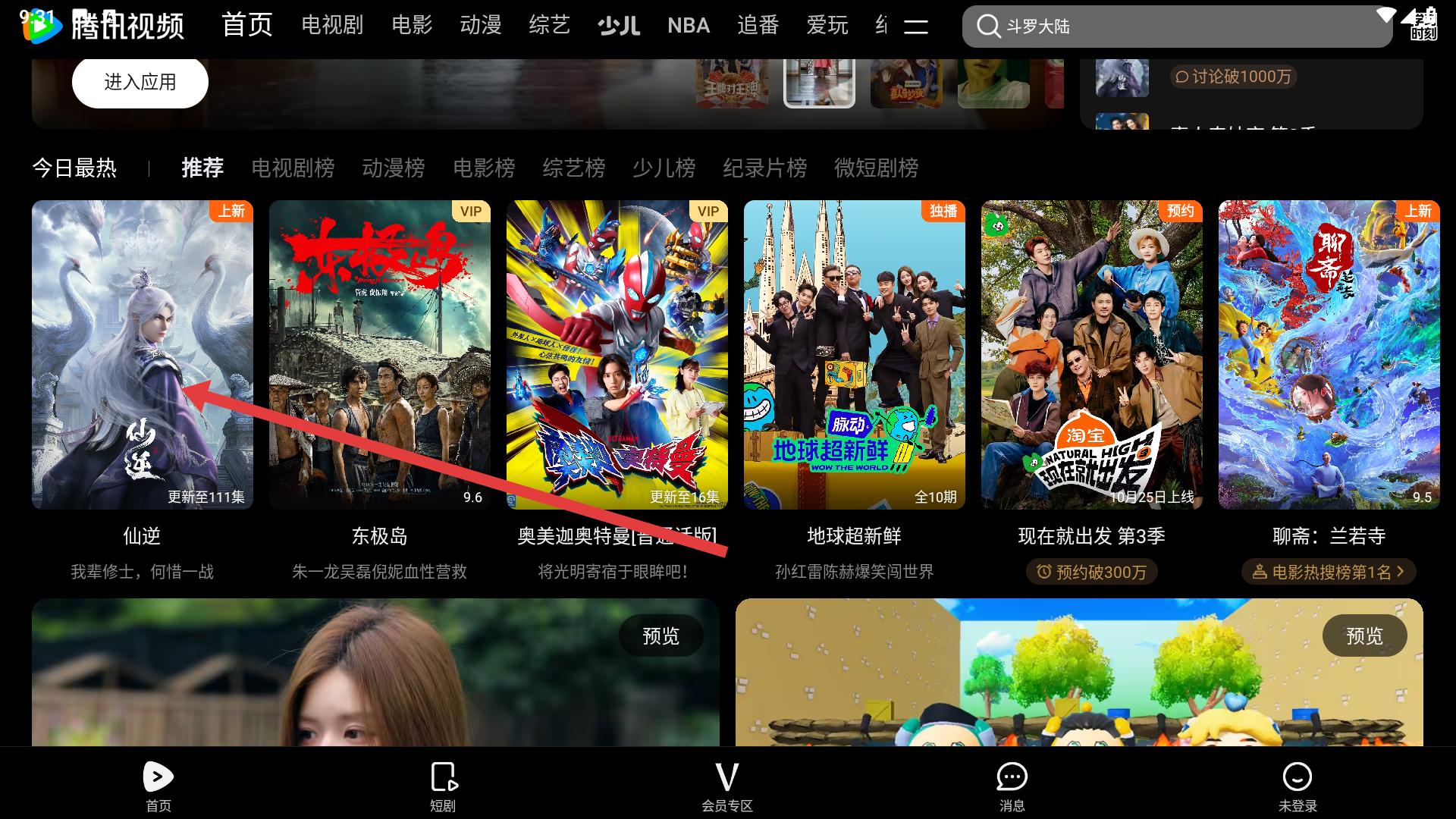 1、打開騰訊視頻,在首頁找到想要分享的內容,比如點擊推薦里的仙逆,進入視頻播放頁面。