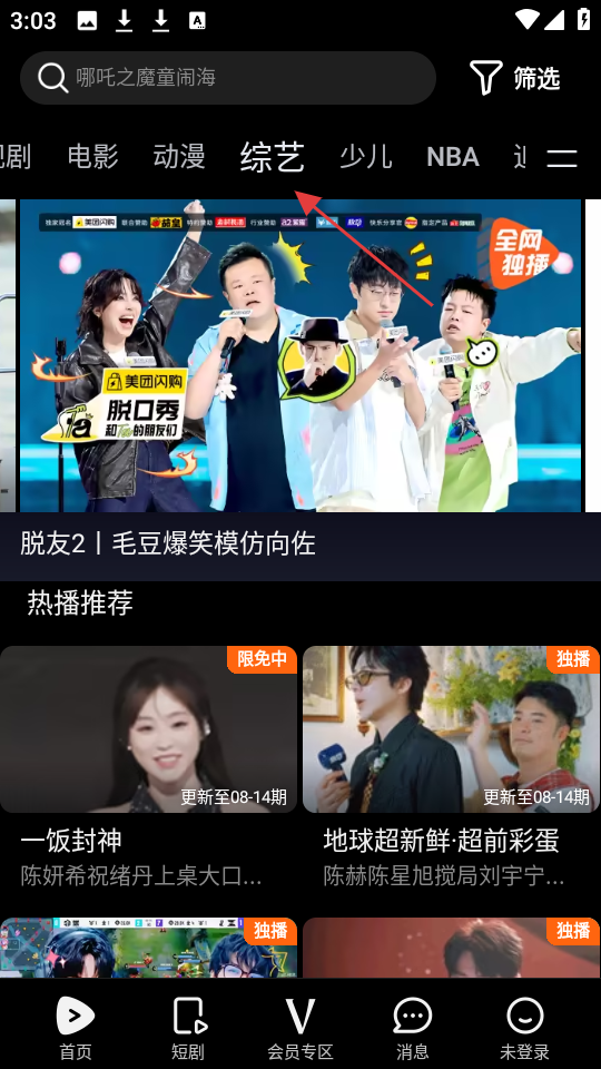 3、騰訊視頻首頁界面豐富,搜索與分類清晰熱播推薦醒目,像脫口秀和朋友們等綜藝在列,涵蓋多領域內容。