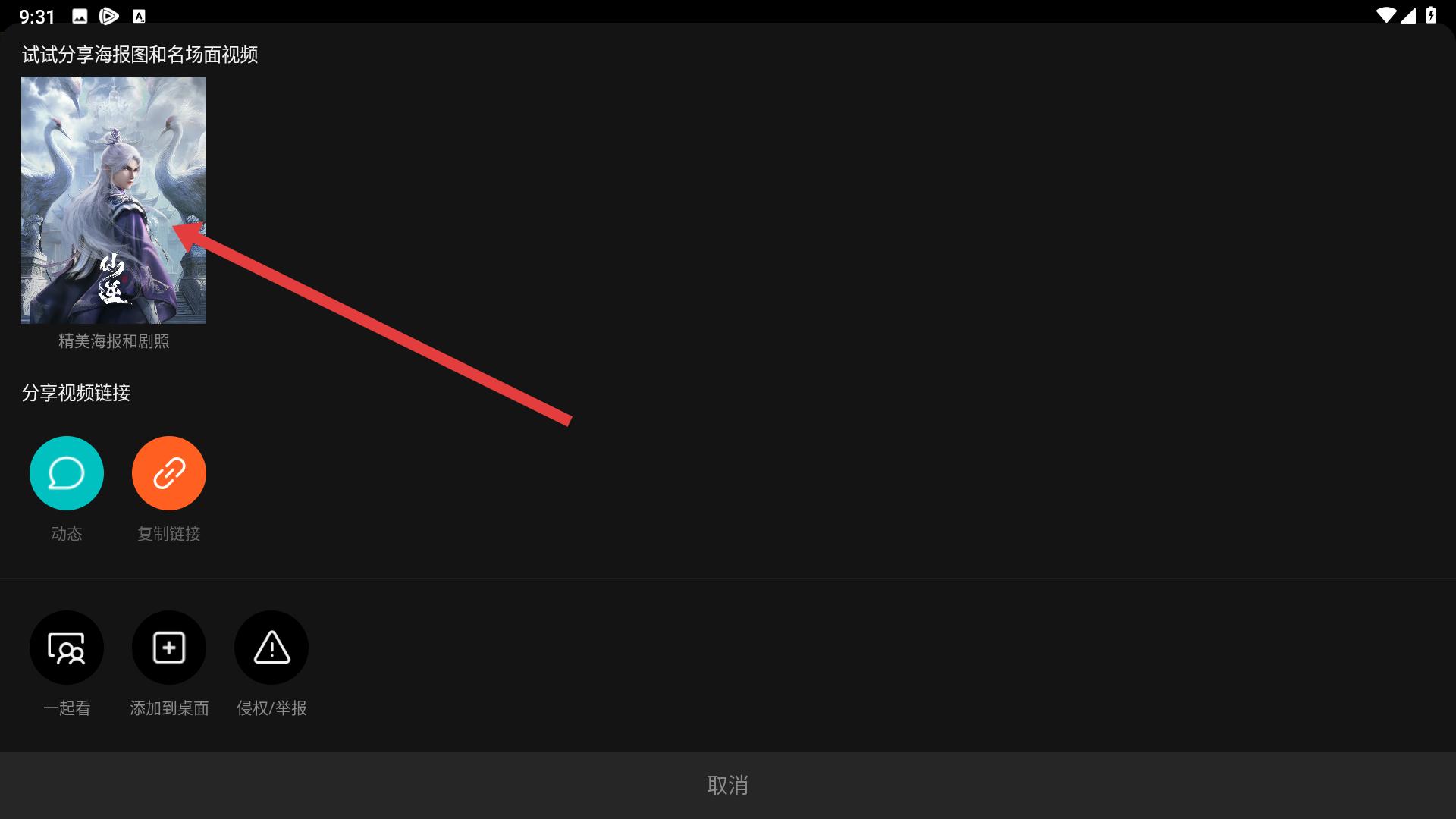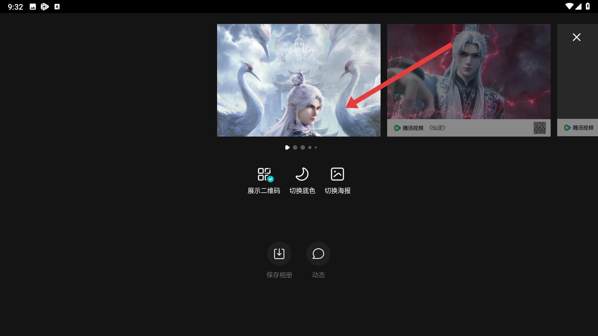 3、分享選項界面,可看到精美海報和劇照,點擊相關海報,進入海報展示界面。
