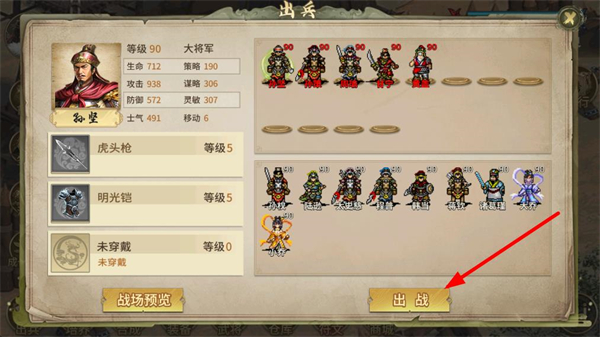 3、在出兵界面,可查看武將裝備和屬性,選擇出戰武將后點擊出戰,即可讓武將參與戰場戰斗。
