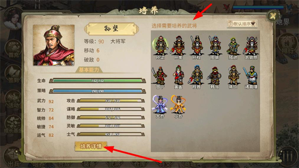 2、進入培養界面,可選擇要培養的武將,查看武將如孫堅的等級、能力等信息,點擊培養詳情可進行武將培養操作。