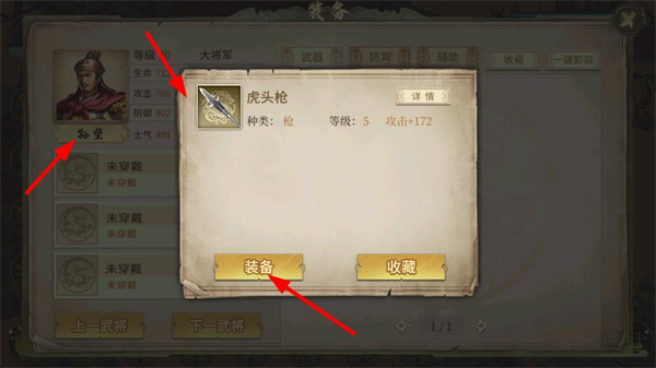 1、在裝備界面可查看武將如孫堅的裝備,點擊裝備可讓武將穿戴如虎頭槍的武器,提升武將攻擊等屬性。
