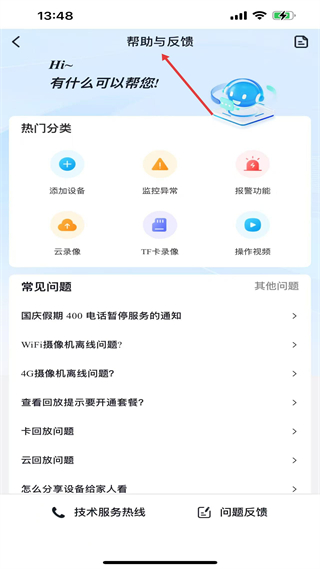 3、幫助與反饋頁,有添加設備等熱門分類,羅列常見問題,提供技術熱線和反饋渠道,是用戶獲取幫助板塊。